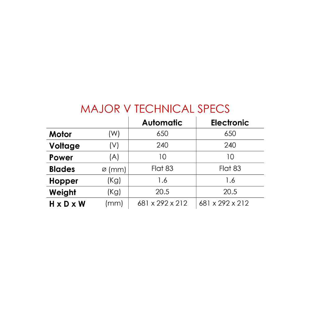 The Major VP Electronic is the fastest grinder from the Mazzer V line. It's innovative components allow for higher grinding speeds at lower RPM (900 rpm @50Hz). Major VP is designed to handle high volumes of coffee beans without overheating due to the grinder's high torque asynchronous motor. The low rpm motor produces less noise and less strain on components, resulting in a longer lifespan of the grinder and its parts. The Major VP comes equipped with adjustble height portafilter holder also includes a portafilter activated dosing button to grind coffee hands-free and IoT technology.
