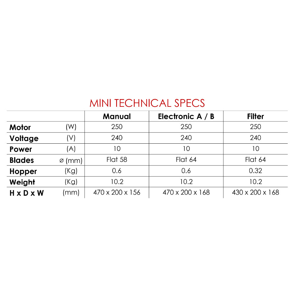 The Mini Electronic B is a compact coffee grinder designed for low volume cafés, the home barista, or to add a secondary espresso option to an existing café. The Mini Electronic B features a portafiter activated button to grind the coffee, rather than the electronic touch pad on the Mini Electronic A. The dose for the portafilter activator can be programmed with the buttons on the control panel.